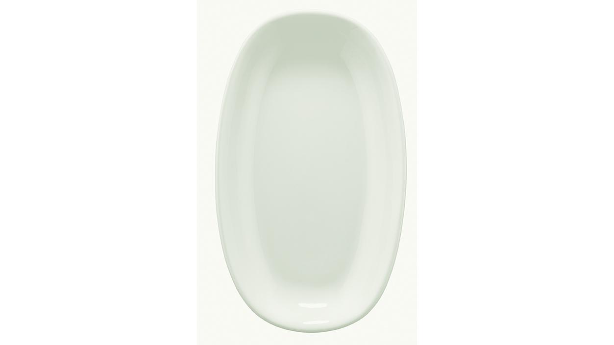 Блюдо белого цвета со сливочным оттенком.