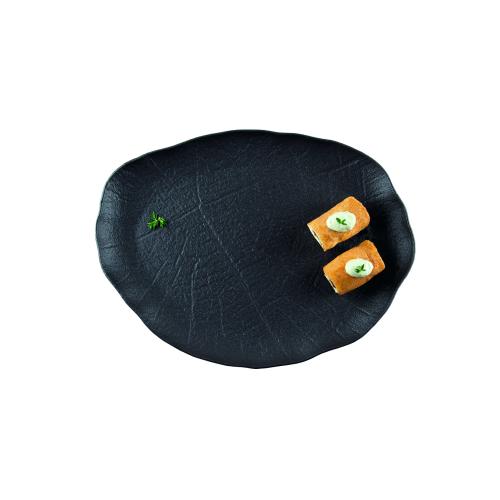 Блюдо для подачи насыщенного черного цвета со стилизацией поверхности под рисунок листьев лотоса.