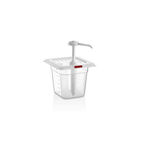 Диспенсер для соуса изготовлен из полипропилена, предназначен для дозированной подачи соусов и заправок на профессиональных кухнях. Оснащен помпой-дозатором 25 мл с блокировкой подачи. В комплект входит удлиняющая трубка. Разборная помпа-дозатор обеспечивает простоту ухода и очистки. Прозрачный корпус позволяет контролировать уровень наполнения. На крышке имеется цветная вставка для маркировки содержимого.