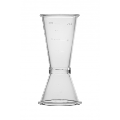 Джиггер из пластика представляет собой два мерных стаканчика объемом 20 и 40 мл, спаянных в основании.