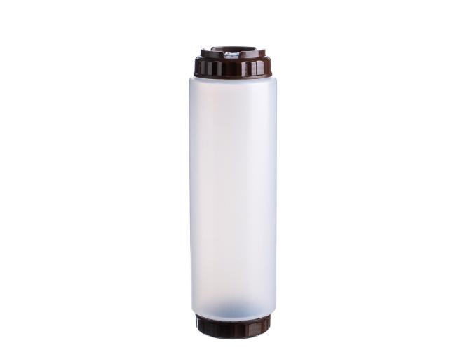 Емкость для соуса 1000 мл выполнена из прочного пищевого пластика и предназначена для профессионального использования в сегменте HoReCa. Конструкция имеет две откручивающиеся крышки и съемный силиконовый клапан, что обеспечивает удобство наполнения, использования и ухода, а также позволяет дозировать содержимое без подтеков и экономит место для хранения. Коричневый цвет служит маркировкой для соуса барбекю, шоколада и топпингов. Прозрачный корпус облегчает визуальный контроль содержимого. Подходит для мытья в посудомоечной машине.