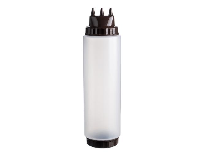 Емкость для соуса 1000 мл выполнена из прочного пищевого пластика и предназначена для профессионального использования в сегменте HoReCa. Конструкция с двумя откручивающимися крышками обеспечивает удобство наполнения, использования и ухода. Тройной дозирующий носик позволяет быстро и точно распределять содержимое. Коричневый цвет служит маркировкой для соуса барбекю, шоколада и топпингов. Прозрачный корпус облегчает визуальный контроль содержимого. Подходит для мытья в посудомоечной машине.