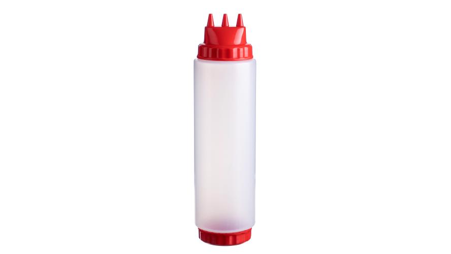 Емкость для соуса 1000 мл выполнена из прочного пищевого пластика и предназначена для профессионального использования в сегменте HoReCa. Конструкция с двумя откручивающимися крышками обеспечивает удобство наполнения, использования и ухода. Тройной дозирующий носик позволяет быстро и точно распределять содержимое. Красный цвет служит маркировкой для кетчупа и острого соуса чили. Прозрачный корпус облегчает визуальный контроль содержимого. Подходит для мытья в посудомоечной машине.