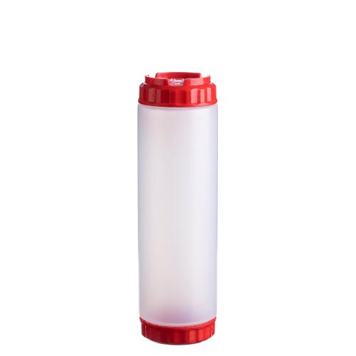 Емкость для соуса 750 мл выполнена из прочного пищевого пластика и предназначена для профессионального использования в сегменте HoReCa. Конструкция имеет две откручивающиеся крышки и съемный силиконовый клапан, что обеспечивает удобство наполнения, использования и ухода, а также позволяет дозировать содержимое без подтеков и экономит место для хранения. Красный цвет служит маркировкой для кетчупа и острого соуса чили. Прозрачный корпус облегчает визуальный контроль содержимого. Подходит для мытья в посудомоечной машине.