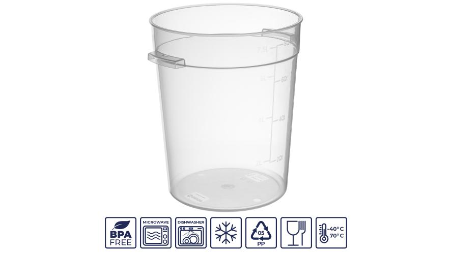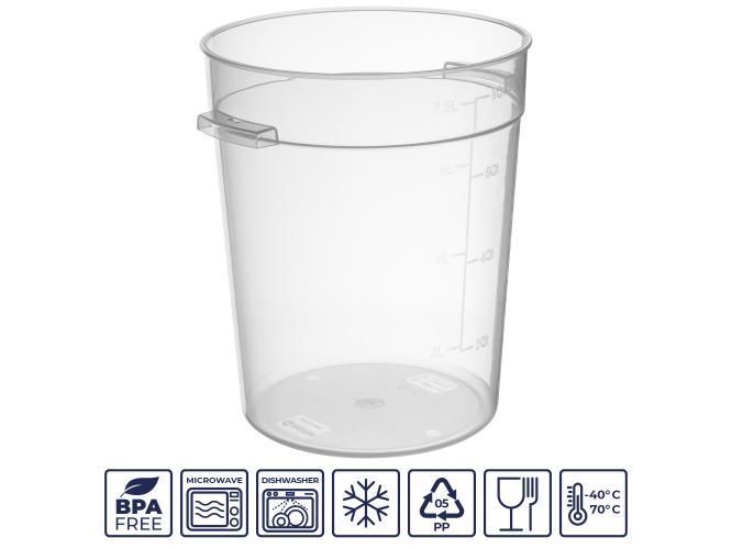 Контейнер для продуктов круглый 7,5 л. d=22 см. h=27 см., с мерной шкалой, прозрачный, п/п, без крышки (крышка 76736, 76735, 76734, 76737) GP /1/8/