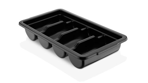Емкость для столовых приборов (53*29*9,5 см) из полипропилена на 4 секции. Удобные ручки обеспечивают надежный хват. Возможность штабелирования экономит место при хранении. Подходит для мытья в посудомоечной машине.