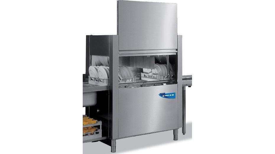 Посудомоечная машина конвейерная Выход посуды справа налево Объем машины: 70 л Цикл: 60-120-180 сек Расход воды: 200 л/час, 2 л/тарелка Высота корзины 100 мм Подключение холодной воды Дозатор моющего и ополаскивающего средства