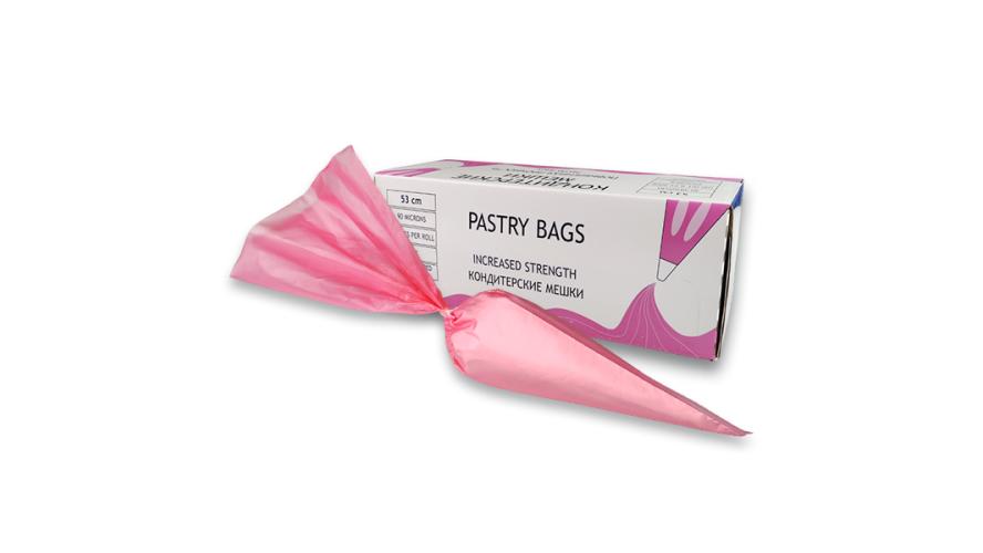 кондитерский мешок из трехслойного полиэтилена высокого и низкого давления розового цвета. Благодаря специальной технологии изготовления, полиэтилен обладает эффектом мягкой поверхности, что делает мешок очень приятным и гуманным для рук кондитера при длительной работе, антискользящее покрытие снаружи мешка обеспечивает прилегание руки кондитера и недопущение проскальзываний, а максимально гладкая поверхность внутри обеспечивает легкий выход продукта без остатков Мешок обладает высокой прочностью за счет большой толщины слоеного пластика 90мк. и практически неразрываемого двойного шва