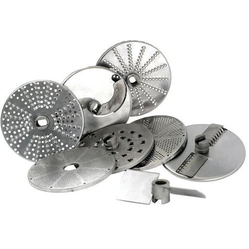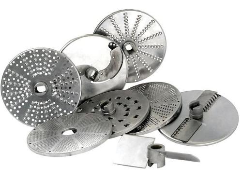 Комплект 6 дисков для CL 30, CL40: слайсер 2 мм (огурцы, лук) и 4 мм (помидоры, перец), терка 2 мм (морковь, свекла, сыр), соломка 4x4 мм, комплект для нарезки кубиками: ломтики 10 мм + решетка 10Х10 мм (морковь, вареный картофель).