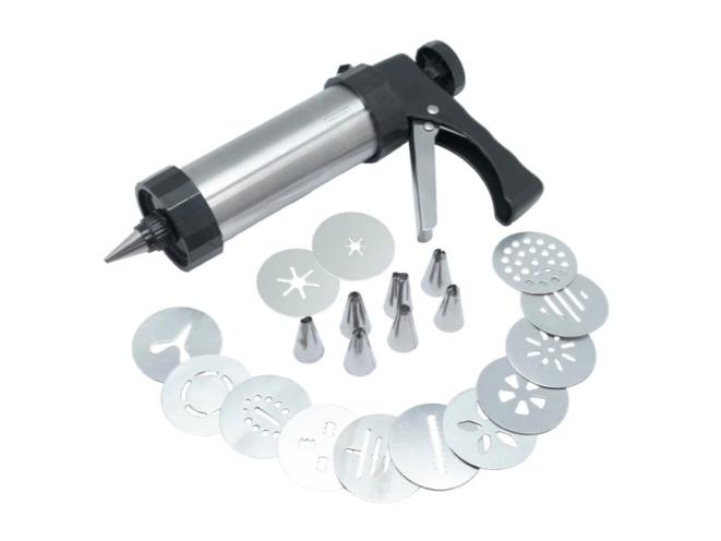 Шприц кондитерский с комплектом из 8 насадок (нерж.) и 13 формирующих дисков (алюм.). Предназначен для порционной подачи теста, крема, муссов.