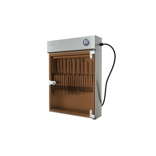 Дверь оснащена замком. Держатель для ножей выполнен из нержавеющей стали и рассчитан на 18 ножей.