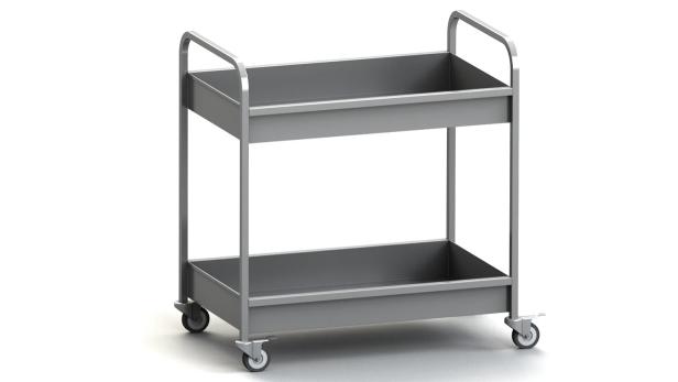 Тележка имеет 2 полки глубиной 100 мм. и 4 поворотных колеса с тормозом.