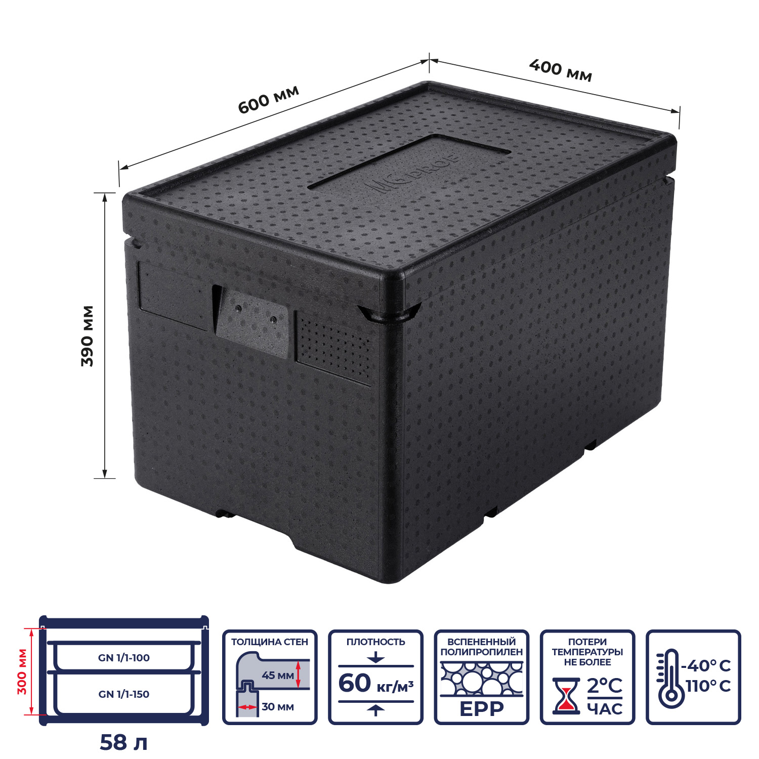 Термоконтейнер MGprof объемом 58 литров — идеальное решение для хранения и транспортировки продуктов в гастроемкостях 1/1, 1/2, 1/3 различной высоты, а также в порционных упаковках. Размеры контейнера 600*400*390 мм, внутренние габариты 540*360*300 мм. обеспечивают удобство и универсальность использования. Изготовлен из прочного и легкого вспененного полипропилена с плотностью 60 кг/м³, что гарантирует надежность и долговечность термоконтейнера.