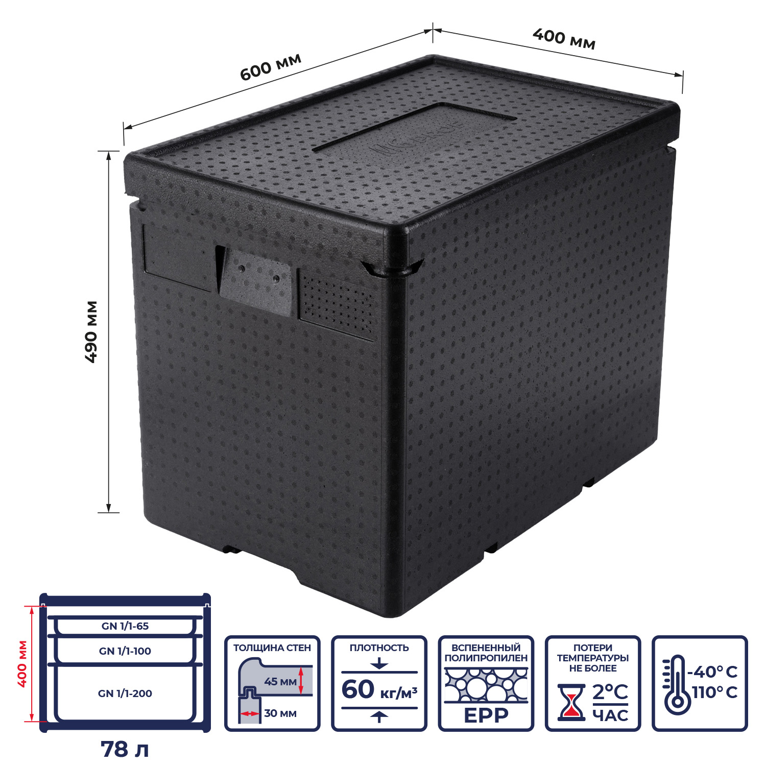 Термоконтейнер 78 л. 600*400*490 мм. для гастроем. h=200 мм. (-40°C до +110°C), плотность 60кг/м3, п/п MGprof /1/2/